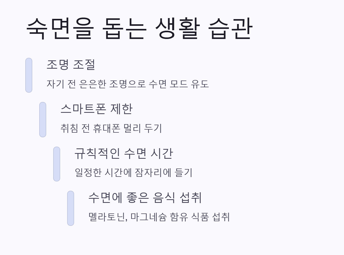 작은 변화들이 쌓이면 수면의 질이 점점 좋아질 거예요.